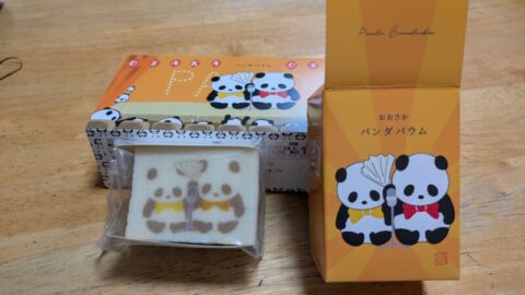 かわいいお土産をいただきました。「大阪パンダバウム」だとか。ハリセン持って漫才してるのね~。