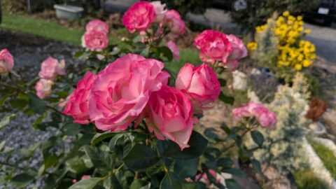 庭にはピンクの花たちや小菊が咲いています。気持ちが和らぎます。